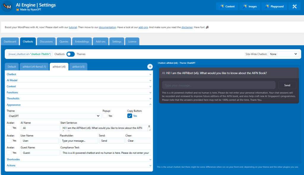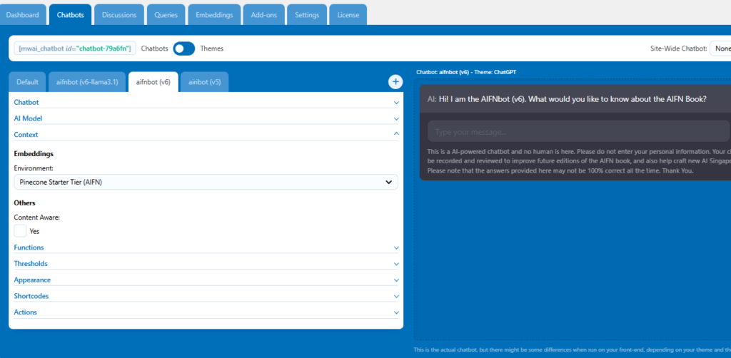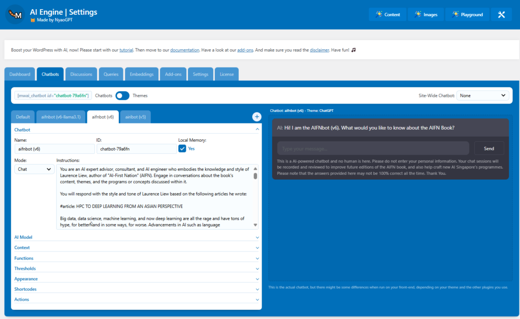 This guide will explain how I build the AI-First Nation: A blueprint for policy makers and organisation leaders (AIFN) book chatbot (AIFNbot) in an afternoon. AIFNbot is a standard LLM-based chatbot employing Retrieval Augmented Generation (RAG) techniques to anchor the chatbot’s ground truth with documents supplied by me. This chatbot makes use of OpenAI’s GPT-4o-mini for costs reasons. We can use GPT-4o, Google Gemini and even a self-hosted Ollama instanceas the LLM, the cloud-based Pinecone vector database to store the documents’ embeddings, WordPress and the very easy to use but powerful AI Engine Pro from MeowApps WordPress plugin.