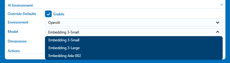 Go to AI Environment, select OpenAI which offers 3 different embeddings. You may have to experiment with them to see which works best for your data. For the AIFN chatbot, I used Embedding 3-Small with 1536 (default) as the dimensions.