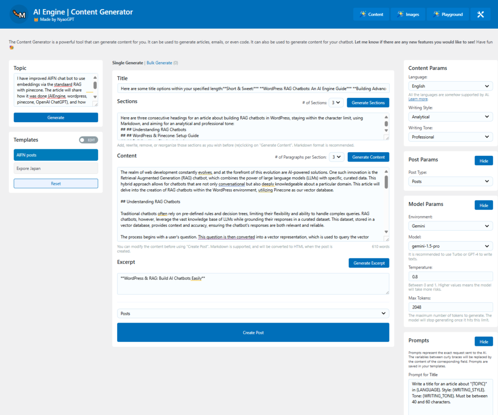 Besides allowing you to create chatbots, AI Engine also provides helpful tools like Content and Image creations right within your WordPress dashboard. In fact, this article’s first draft was generated with AI Engine Pro Content feature.