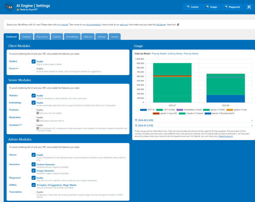 After installing the AI Engine, navigate to its dashboard and ensure that the Chatbot is enabled in the Client Modules. In Server Modules, enable both Statistics and Embeddings. In Admin modules enable those which you want, they are not required for the chatbot feature but some are useful as part of your WordPress site.