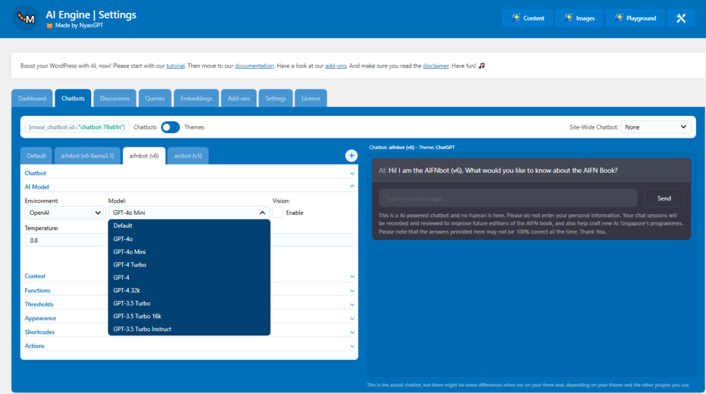 Still in the Chatbot tab, click on AI Model, choose the LLM you want to use. For the AIFNbot(v6), I choose to use GPT4o-mini as the output is decent and cost is low. (AIFN is a self-funded site, including all the LLM APIs calls).