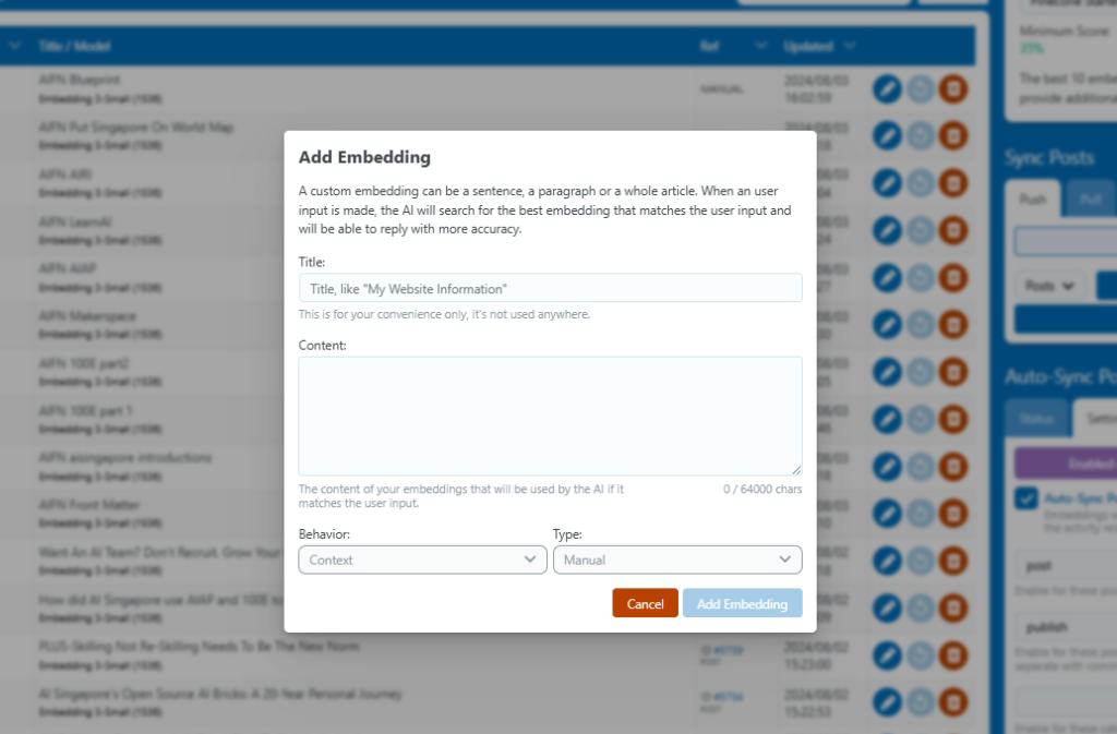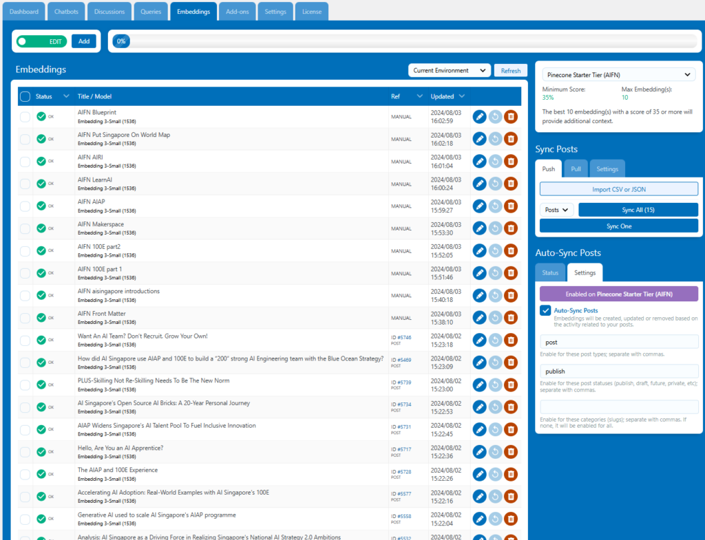 Go to the Embeddings tab. Here you can upload TEXT documents and also select your posts to sync to the Pinecone vector database you setup earlier.