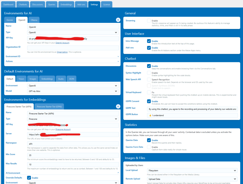 Next tab you want to go to would be the Settings tab. Here, enter your OpenAI API keys, and also your Pinecone API key, and also the Pinecone Server URL. If required, you may wish to enable GDPR consent. I recommend also that you enable Chatbot->Discussions and Statistics-> Queries Data at least during the initial launch/pilot/trial period, so that you can monitor the activities and usage, so that you can adjust your system prompts, change various parameters, etc. Of course, inform your users that their queries and discussions with your chatbot are being recorded.